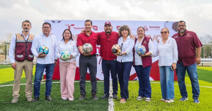 González, Tamaulipas.– La secretaria de Bienestar Social Silvia Casas González, junto al presidente municipal de González, Miguel Alejandro Zúñiga Rodríguez, dio el saque inicial de inauguración del cuadrangular femenil de fútbol “González se Transforma”, en la cancha multideportiva “Urbano Vega Gallegos”, situada en la colonia Jardín de Estación Manuel.