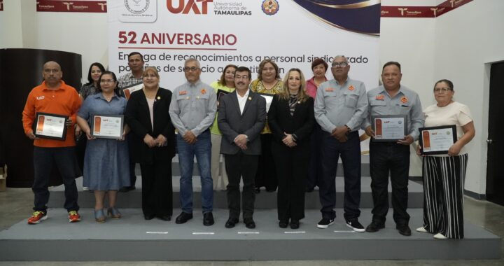 Acompañado de su esposa, la Lic. Isolda Rendón de Anaya, presidenta de Familia UAT, e integrantes de su gabinete, el rector hizo entrega de reconocimientos al personal sindicalizado de las secciones centro, norte, sur y Mante, por su trayectoria de servicio en la institución.