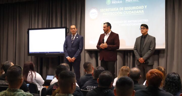 La capacitación es impartida por el oficial Miguel Ángel Alarcón Hernández, adscrito a la Unidad de Antisecuestro y Antiextorsión de la Secretaría de Seguridad y Protección Ciudadana (SSPC) y el agente investigador Carlos Roberto Medina Palma, quienes compartieron conocimientos especializados para fortalecer la capacidad operativa identificando las diversas modalidades de extorsión y de respuesta ante situaciones de crisis generadas por el delito de extorsión.